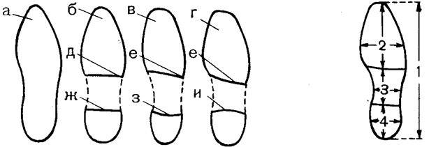 Элементы подошвы обуви и основные измерения, производимые при описании следа обуви: