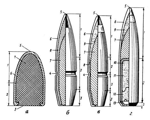 Устройство пуль унитарных патронов (г – устройство бронебойно-зажигательно-трассирующей пули не описывать)
