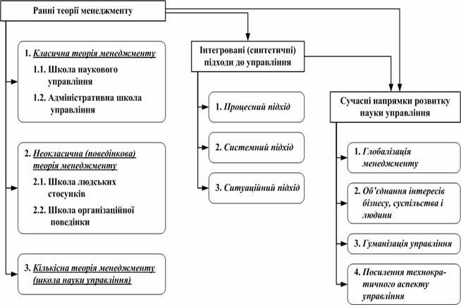 На відміну від інших наук розвиток управлінської думки не був системою знань, які накопичувалися послідовно. Навпаки, на першому етапі (до середини ХХ століття) наука управління розвивалася одразу за кількома відносно самостійним напрямкам (або, як кажуть, підходам до управління), кожний з яких концентрував увагу на різних аспектах менеджменту.