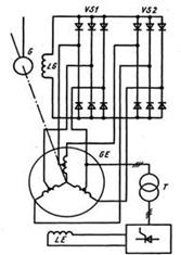 Вспомогательный генератор GE имеет на статоре трехфазную обмотку с отпайками. Каждая часть обмотки подсоединена к двум группам тиристоров: рабочей VS1 и форсировочной VS2. При форсировке VS2 питающиеся от полного напряжения GE, открываются полностью и дают весь ток форсировки. Рабочая группа при этом запирается более высоким напряжением форсировочной группы. Тиристорная система возбуждения имеет наибольшее быстродействие по сравнению с другими системами и kф > 2. Все генераторы имеют контактные кольца на валу ротора, к которым ток подводится с помощью щеток, что обуславливает снижение надежности.