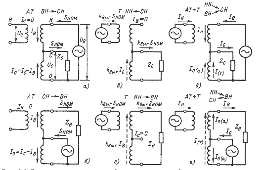 а, б – автотрансформаторные режимы; в, г - трансформаторные режимы; д, е – комбинированные режимы.