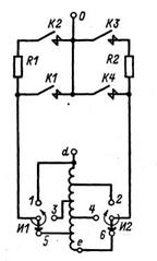 В исходном положении 0, ТР работает на ответвлении 5 и ток проходит через контакт К1. При переходе на ответвление 4 сначала обесточенный избиратель И2 переводится в положение 4, затемотключается К1, при этом ток нагрузки кратковременно проходит по R1 и К2. После этого замыкается К3, при этом половина тока нагрузки проходит по R1 и К2, а половина – по R2 и К3, а витки регулировочной обмотки 5-4 оказываются замкнутыми через R1 и R2 и по ним проходит циркулирующий ток. Затем замыкается К2 и К4, при этом ток проходит по регулировочной обмотке на ответвление 4, избиратель И2, контакты К4 к выводу 0. Управление РПН осуществляется дистанционно со щита управления, вручную или автоматически.