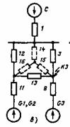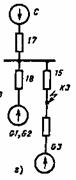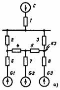 В процессе преобразования схемы замещения часто возникает задача разделения, так называемых, связанных цепей, когда токи от нескольких источников проходят через общее сопротивление х4. Для того чтобы определить ток, поступающий к точке КЗ от каждого источника, необходимо преобразовать схему к лучевому виду, показанному на рисунке 7.1 г.