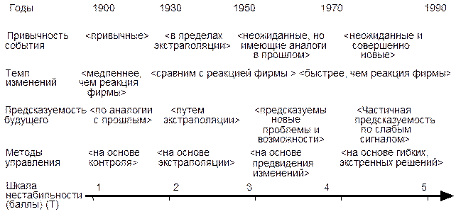 Видно, что основная тенденция развития мирового рынка состоит в непрерывном увеличении его изменчивости и нестабильности. Недаром в качестве некой обобщенной меры состояния рынка на диаграмме приведена шкала нестабильности в баллах, где большее количество баллов соответствует повышению уровня нестабильности. Эта шкала приведена здесь в связи с тем, что и сегодня ряд предприятий и отраслей могут работать в условиях относительной стабильности (газовая, нефтяная, лесная промышленность - индекс 2-2, 5), а другие - в обстановке большой нестабильности (радиотехническая, автомобильная-соответствующий индекс 4-5).