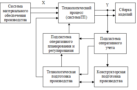 Входами в систему ТП служат материальные потоки в виде заготовок и управляющая информация в виде технологической документации, плановых заданий. Эта информация содержит алгоритм управления процессом обработки деталей и календарные сроки их изготовления. К выходам системы относятся изготовленные детали и информация о технологических отклонениях, возникающих при их изготовлении, регистрируемых подсистемой оперативного учета. В подсистеме оперативного планирования и регулирования часть отклонений компенсируется, а информация о более серьезных отклонениях, таких как отсутствие или поломка инструмента, несоблюдение технологических размеров и др., передается подсистемой оперативного учета в подсистемы технологической и конструкторской подготовки производства.