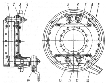 Тормозные механизмы (рис. 1) установлены на всех шести колесах автомобиля, основной узел тор мозного механизма смонтирован на суппорте 2, жестко связанном с фланцем моста. На эксцентрики осей 1, закрепленные в суппорте, свободно опираются две тормозные колодки 7 с прикрепленными к ним фрикционными накладками 9, выполненными по серповидному профилю в соответствии с характером их износа.