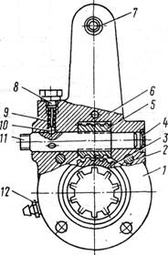 Оси колодок с эксцентричными опорными поверхностями позволяют при сборке тормозных механизмов правильно сцентрировать колодки относительно тормозного барабана. Тормозной барабан крепится к ступице колеса пятью болтами. При торможении колодки раздвигаются S-образным кулаком 12 и прижимаются к внутренней поверхности барабана. Между разжимным кулаком 12 и колодками 7 установлены ролики 13, снижающие трение и улучшающие эффективность торможения. В отторможенное состояние колодки возвращаются четырьмя оттяжными пружинами 8. Разжимной кулак 12 вращается в кронштейне 10, прикрепленном к суппорту болтами. На этом кронштейне устанавливается тормозная камера. На конце вала разжимного кулака установлен регулировочный рычаг 14 червячного типа, соединенный со штоком тормозной камеры при помощи вилки и пальца. Щиток, прикрепленный болтами к суппорту, защищает тормозной механизм от грязи. Регулировочный рычаг предназначен для уменьшения зазора между колодками и тормозным барабаном, увеличивающимся вследствие износа фрикционных накладок. Устройство регулировочного рычага показано на рис 2.