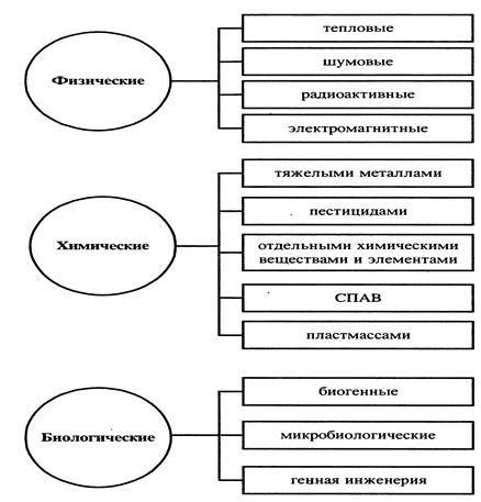 По видам загрязнений выделяют химическое, физическое и биологическое загрязнение (рис.2; по Н. Ф. Реймерсу, 1990; с изменениями).