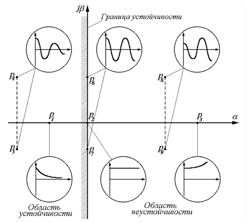 Мнимая ось jb является границей устойчивости в плоскости корней. Если характеристическое уравнение имеет одну пару чисто мнимых корней (pk=+jbk, pk+1=-jbk), а все остальные корни находятся в левой полуплоскости, то в системе устанавливаются незатухающие гармонические колебания с круговой частотой