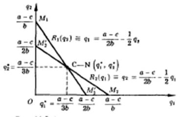 Равновесные выпуски дуополистов и являются координатами точки равновесия выпусков Курно—Нэша (точка С—N). Говорят, что рынок находится в состоянии равновесия Нэша, если ни одно предприятие не хочет изменить своего поведения в одностороннем порядке. Такой тип равновесия назван равновесием Нэша в честь американского математика и экономиста, нобелевского лауреата по экономике (1994) Джона Нэша.
