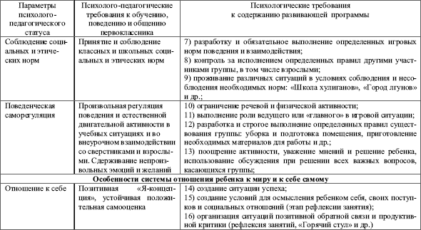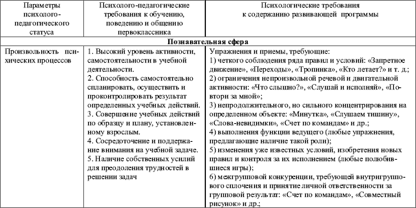 Ниже приводится пример содержания развивающей работы в начальной школе. В табл. 9 представлены параметры психолого-педагогической карты первоклассника, которые наиболее важны в развивающей работе, а также соответствующие им психолого-педагогические требования и требования к содержанию развивающих техник и упражнений.