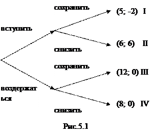 Имеем две ситуации равновесия по Нэшу: (12; 0) и (6; 6). Но Ф1 принимает решение, уже зная решение Ф2. Если Ф2 придерживается максиминной стратегии, то выберет (12; 0). Но одна из главных предпосылок теории игр – рациональность поведения игроков, стремящихся к максимизации своих выигрышей. Насколько вероятна реализация Фирмой 1 стратегии (угрозы) «сохранить объем производства» при вступлении Ф2 в рынок? В этом случае прибыль Ф1 составит 5 млрд.руб., что меньше 6 млрд.руб, которые она получит, если разделит рынок с Ф2. В данных (численных) условиях угроза Ф1 сохранить объем производства в ответ на вторжение Ф2 на рынок является неправдоподобной. Ситуация (6; 6) является не только равновесной по Нэшу, но и учитывает степень правдоподобности угрозы.