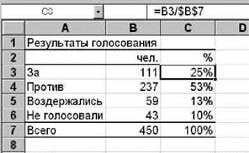 В качестве примера использования в формулах абсолютных ссылок на ячейки рассмотрим обработ-ку результатов голосования (рис. 5.6.3).
