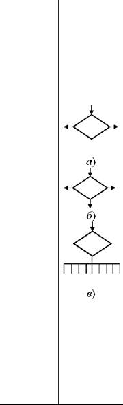 Символ отображает решение или функцию переключатель-ного типа, имеющую один вход и ряд альтернативных выходов (рис. а), один и только один из которых может быть активизи-рован после вычисления усло-вий, определенных внутри это-го символа. Соответствующие результаты вычисления могут быть записаны по соседству с линиями, отображающими эти пути.