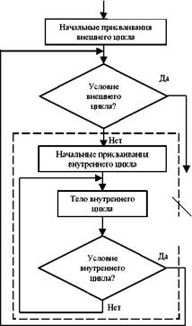 Особенностью рассмотренных структур является то, что все они имеют один вход и один выход и могут быть соединены друг с другом в любой последовательности. В частности, каждая структура мо-жет содержать любую другую в качестве одного из блоков. Например, на рис. 20 изображена часто встречающаяся в реальных задачах вложенная циклическая структура ("цикл в цикле"), в которой тело внешнего цикла (внешний цикл – цикл "ПОКА") является также циклом (внутренний цикл – цикл "ДО"). При этом в соответствии с принципами вложенности внутренний цикл заканчивается раньше, чем внешний цикл.
