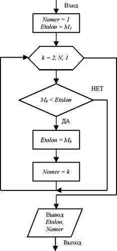 Рассмотрим алгоритм нахождения наименьшего значения и его индекса в одномерном массиве, со-стоящем из N элементов – М (N) (рис. 23). При выборе наименьшего значения вначале задают или вы-бирают некое эталонное значение. Для массива этим значением может являться первый элемент. Затем в цикле начинают перебирать все оставшиеся элементы массива и сравнивать каждый из них с эталон-ным значением. В случае если текущий элемент оказывается лучше эталона, его принимают за новый эталон. При выборе наибольшего значения поступают аналогичным образом.