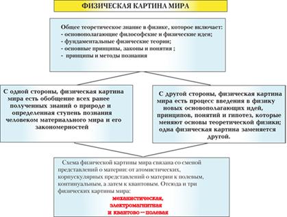 Схема физической картины мира связана со сменой представлений о материи: от атомистических, корпускулярных представлений о материи к полевым, континуальным, а затем к квантовым. Отсюда и три физических картины мира: механистическая, электромагнитная и квантово-полевая.