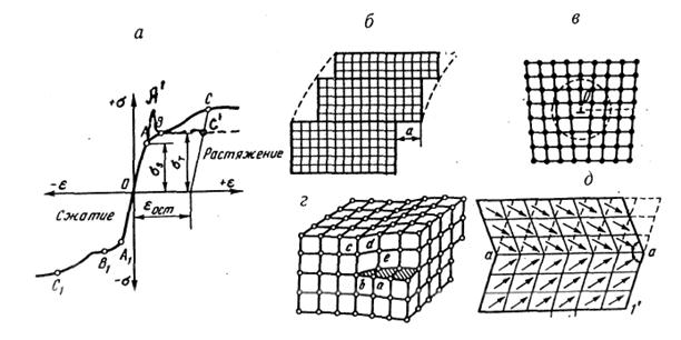 Рис. 1.2. Схемы деформации кристаллов (а), трансляционного скольжения (б), краевой дислокации (в), винтовой дислокации (г) и механического двойникования (д) кристаллов