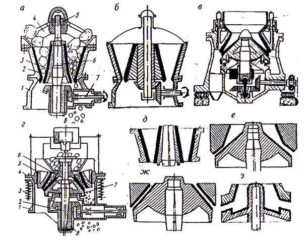 Рис. 3.5. Схемы устройства (а-г) и профилей рабочего пространства (д-з) конусных дробилок для крупного (а, б, д), среднего (в, г, е) и мелкого (г, ок. з) дробления