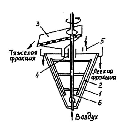 В конусном корпусе 1 сепаратора на полом валу 6 вращается мешалка 2. Исходная руда подается по загрузочному лотку 5 и подвергается расслоению в суспензии, поступающей через осевую воронку 4. Тяжелая фракция руды погружается в нижнюю часть конуса и с помощью сжатого воздуха аэролифтом выгружается на желоб, в днище которого установлены дуговые грохоты 3 для сброса и возврата в сепаратор части кондиционной тяжелой суспензии. Легкая фракция удаляется из сепаратора через регулируемый порог на борту конуса переливом вместе с частью суспензии и направляется для отделения и отмывки ее на грохотах.