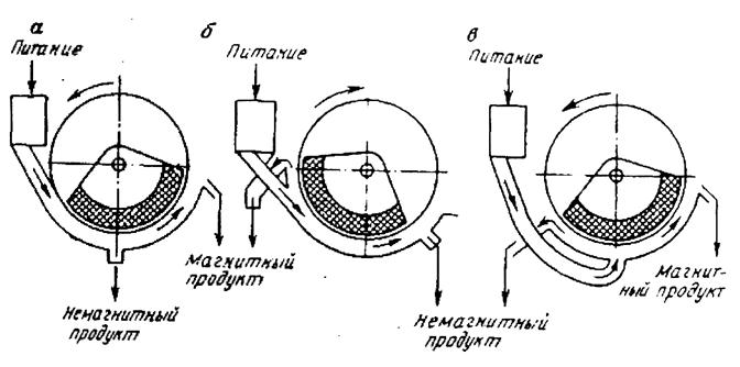 Рис. 5.3. Магнитные барабанные сепараторы для мокрого обогащения с прямоточной (а), противоточной (б) и полупротивоточной (в) винной
