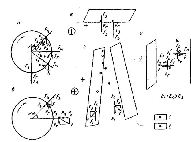 Рис. 6.1.Векторные диаграммы сил, действующих на частицы в сепараторах: а, б — барабанном электростатическом; в — плоскостном электростатическом; г — камерном электростатическом; д — диэлектрическом; 1 — положительно заряженная частица; 2 — отрицательно заряженная частица
