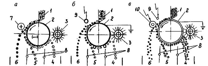 Рис. 6.2. Схемы электростатического (а), коронно-электрического (б) и коронно-электростатического (в) сепараторов