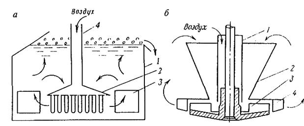 Рис. 8.5. Схема поперечного разреза флотационной машины с пальцевым аэратором (а) и аэратора флотационных машин ФПМ и «Денвер ДР» (б)