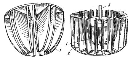Аэратор прямоточных флотационных машин типа ОК (Финляндия) с объемом камеры до 100 м3 состоит (рис. 8.6) из лопастного ротора 1 и радиального статора 2. Ротор представляет собой диск, к которому снизу по кругу крепятся 10 элементов. Каждый элемент состоит из двух радиальных лопастей сложного профиля и имеет V-образную форму. Лопасти соседних элементов параллельны и между ними имеются щели, из которых воздух, подаваемый через полый вал 3, выходит в камеру.