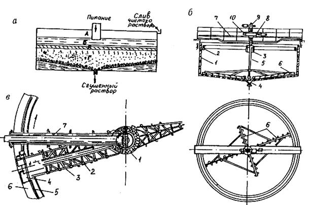 Рис. 9.1. Схема зон осаждения пульпы в сгустителях (а) и конструкции одноярусных радиальных сгустителей с центральным (б) и периферическим (в) приводом