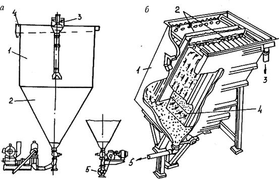 В последнее время на угольных фабриках для сгущения шламов и хвостов флотации кроме радиальных сгустителей используются также цилиндроконические сгустители с осадкоуплотнителем (рис. 9.2, а), состоящие из цилиндрической 1 и конической 2 частей, питателя 3, сливного кольцевого желоба 4 и разгрузочного устройства 5 для сгущенного продукта. Цилиндрическая часть обеспечивает необходимую степень осаждения тонких зерен, а коническая — уплотнение осадка до 80 ° о твердого при удельной производительности на 1 м2 поверхности несколько большей, чём у радиальных сгустителей. Для сгущения рудных тонкодисперсных продуктов начинают применять пластинчатые сгустители (рис. 9.2, б), представляющие собой камеру 1, в которой установлены пакеты параллельных плоскостей 2 общей площадью до 1000 м2, из стеклопластика или нержавеющей стали, расположенных на расстоянии 30—50 мм друг от друга под углом 25—60° к горизонту. Это позволяет разделить поток на струи 4 с ламинарным движением, значительно уменьшить путь оседания твердых частиц и тем самым резко увеличить удельную производительность сгущения на горизонтальную площадь всех плоскостей. Твердые частицы оседают на наклонные плоскости, перемещаются вниз и удаляются через патрубок 5; осветленная жидкость поднимается вверх и сливается через патрубок 3. Разгрузка сгущенного продукта до 60—75 % твердого может быть автоматизирована; регулирование его плотности при этом может осуществляться с использованием гамма-лучей, ультразвука или электропроводности пульпы, а изменение скорости разгрузки — «наложением» на пакет пластин вибрации с малой амплитудой колебаний.