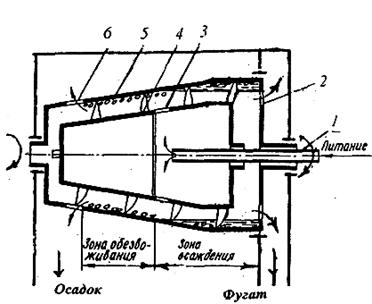 Рис. 9.9. Схема осадительной центрифуги со шнековой выгрузкой осадка