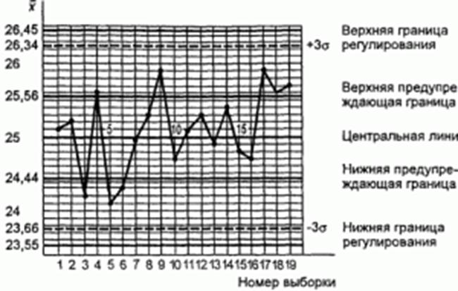 После 19-й выборки необходимо принять решение о наладке процесса, так как последние три точки (25,9; 25,6; 25,7) находятся в зоне W между предупреждающей границей и границей регулирования.