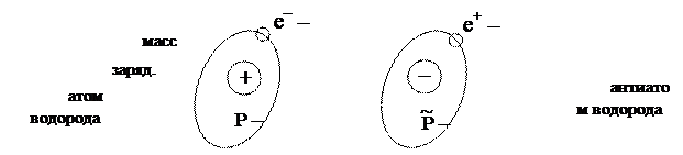 Антивещество. Современная физика показывает, что каждой частице вещества соответствует античастица. Например: электрону соответствует позитрон («+» частица), протону соответствует антипротон. Так, атом водорода состоит из «+» ядра протона и «–» заряженной частицы электрона вращающегося относительно ядра.