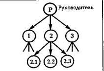 Её особенности – планирование работ и контроль их выполнения осуществляется по вертикали от руководителя (нулевой уровень) к производственным подразделениям (1,2,3), выполняющим управленческие функции. Она образуется в результате построения аппарата управления только из взаимоподчиненных органов в виде иерархической лестницы.
