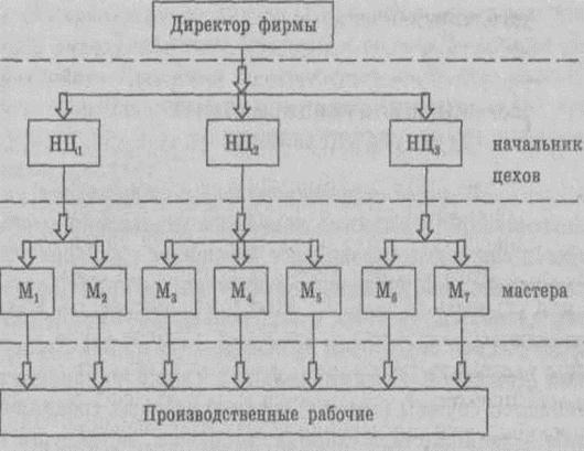 Ее достоинство - простота и четкость взаимосвязей. Используется на небольших предприятиях с несложными управленческими функциями. Однако при многопрофильном процессе производства руководитель должен обладать суммой специальных знаний по организации производства разнохарактерных работ, что существенно осложняет его работу.(Пример на рис)