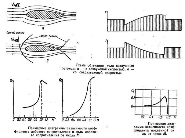 Если возмущение производится в потоке воздуха, то звуковые волны распространяются радиально со скоростью звука и одновременно сносятся потоком на расстояние, равное его скорости. Конечный результат зависит от отношения скорости потока к скорости звука, т.е. величины числа М.