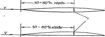 Такие профили по сравнению с обычными имеют меньшее лобовое сопротивление. При их обтекании переход ламинарного (плавного) течения воздуха в турбулентное (завихренное) происходит позже', чем при обтекании обычных профилей. Поэтому они получили название ламинизированных. Для того, чтобы отодвинуть волновой кризис (увеличить Мкр), выбирается стреловидная форма крыла в плане с углом стреловидности до 60°.