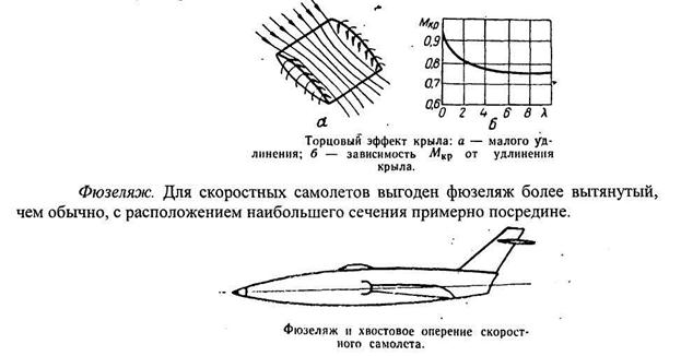 Для скоростных самолетов крылья больших удлинений не приемлемы, так как они способствуют возникновению волнового кризиса. У них крылья малых удлинений (l < 3). Мало удлиненные крылья позволяют значительно увеличить критическое число М и уменьшить влияние волнового кризиса. Это объясняется физической картиной обтекания крыла, влиянием так называемого «торцового эффекта». У такого крыла происходит перетекание воздуха через боковые кромки (рис.а), что приводит к выравниванию давлений на его нижней и верхней поверхности у торцов. Чем меньше удлинение крыла, тем на больший его участок распространяется это выравнивание. Увеличение Мкр у крыльев малых удлинений показано на графике (рис.б).