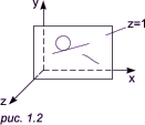 Геометрическая интерпретация на случай двухмерного пространства: введение третьей координаты, равной единице, можно трактовать как переход в трехмерное пространство, в котором разрешено работать только в плоскости z = 1. Следует представлять себе, что экран компьютера (картинная плоскость, плоскость изображения) находится в плоскости z = 1: