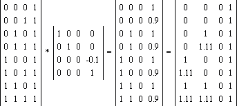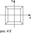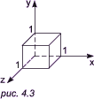 А теперь для примера отобразим куб, стороны которого равны единице (см. рис. 4.3), на плоскость z = 0; пусть на оси z фокус F = -10 и, следовательно, r = -1/10 = -0.1: