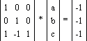 Представим систему уравнений в виде произведения матриц: первая из них содержит координаты точек A, B и C, вторая — неизвестные a, b и c, третья — правые части уравнений: