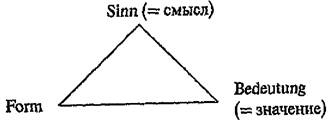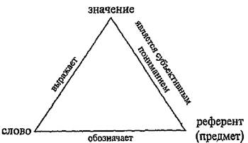 Этот треугольник отображает известное уже со времен средневековых грамматик положение о том, что форма языкового выражения обозначает «вещь» посредством «понятия», ассоциируемого с формой в умах говорящих на данном языке. Уже с помощью такой упрощенной схемы можно рассмотреть некоторые из узких пониманий «значения». Одни из них называются субстанциональными, поскольку «значение» в них выступает как материальная или идеальная субстанция, другие — реляционными, поскольку «значение» трактуется как отношение (между субстанциями).