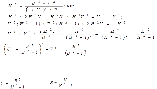 При H(w)=H=const выражение определяет в неявном виде некоторую функциональную зависимость между U и V. Геометрически на плоскости (U,jV) эта зависимость сводится к кривой, представляющей собой геометрическое место всевозможных значений U и V, при которых АЧХ замкнутой системы имеет постоянное значение H. Для каждого значения H (*) определяет свою кривую на плоскости (U;jV). Найдём уравнение семейства кривых H=const. Для этого возведём обе части (*) в квадрат и преобразуем его.