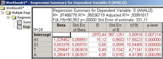 Наибольшее влияние на зависимую переменную S оказывает переменная A1, затем S1, далее Т и А. Коэффициенты к5 и к6 очень малы, поэтому переменные W и P пренебрежимо мало влияют на переменную S