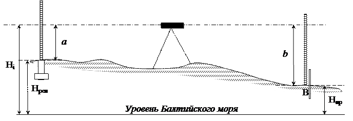 Проектный горизонт Нпр т. В строят на местности с помощью нивелира и рейки (рис. 10.3). Посередине между репером с известной отметкой Нреп и т. В устанавливают нивелир.