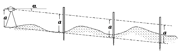 Построение проектной линии состоит в том, что на местности ставят ряд колышков, их верхний срез должен быть на одной прямой линии с заданным уклоном.