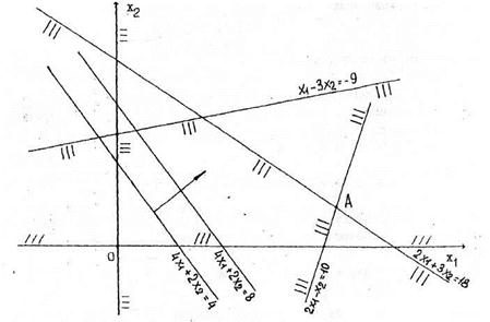 Этот пример отличается от предыдущего только тем, что целевую функцию нужно минимизировать, а не максимизировать. Линию уровня нужно перемещать в направлении, противоположном тому, которое указано на рисунке 2.3 стрелкой. Так как линия уровня параллельна прямой