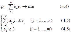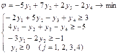 Теперь запишем двойственную задачу. Каждому линейному ограничению (кроме требований неотрицательности переменных) сопоставим переменную двойственной задачи. Затем, двигаясь вдоль столбцов, запишем целевую функцию и ограничения двойственной задачи. Получим: