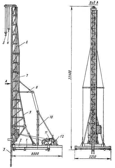 В массовом жилищном строительстве для погружения свай длиной до 8 м применяют мостовые копровые установки на гусеничном или рельсовом ходу (рисунок 2.11).